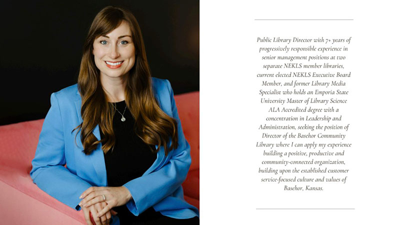 “I am thrilled to have the opportunity to work with such an enthusiastic and talented team at the Basehor Community Library! I am looking forward to connecting with the community and leading the library forward to provide top-notch services that reflect the library board’s vision and values in the thriving community of Basehor.”